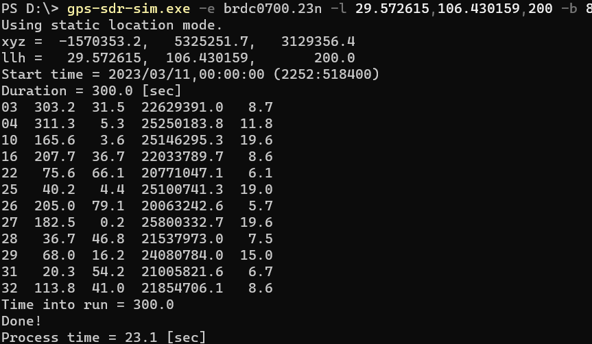 gps-sdr-sim.exe -e brdc0700.23n -l 29.572615,106.430159,200 -b 8