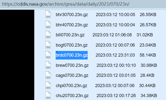 可以知道其中DDD/YYd/YYn/brdcDDD0.YYn.gz也就是我们需要的YYYY年DDD日的GPS星历文件,比如https://cddis.nasa.gov/archive/gnss/data/daily2023/070/23n/brdc0700.23n.gz: