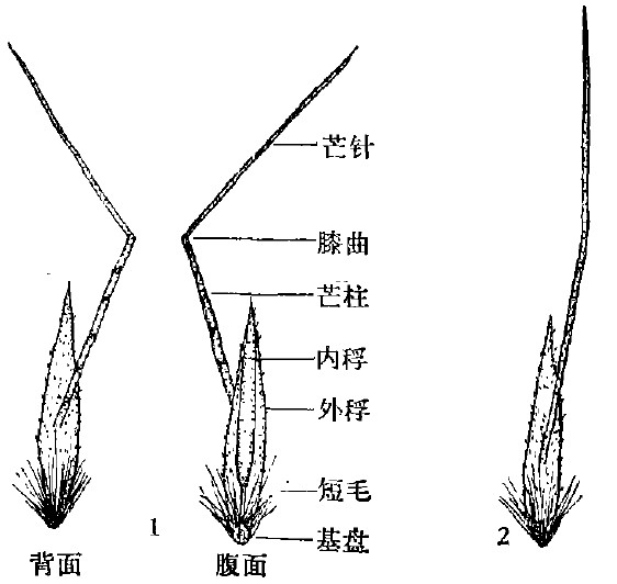 野燕麦的种子由基盘、短毛、外稃[fū]、内桴[fú]、主芒(芒柱),膝曲和芒针构成。 长芒约2-4厘米,中部有一膝曲,膝曲上部称芒针,下部为芒柱。野燕麦的主芒是由两束纤维细胞平行排列的纤维束相互缠绕而成双螺旋的平直圆柱体,两束纤维宽度比约为1:2,通常柱体可捻转5周左右。