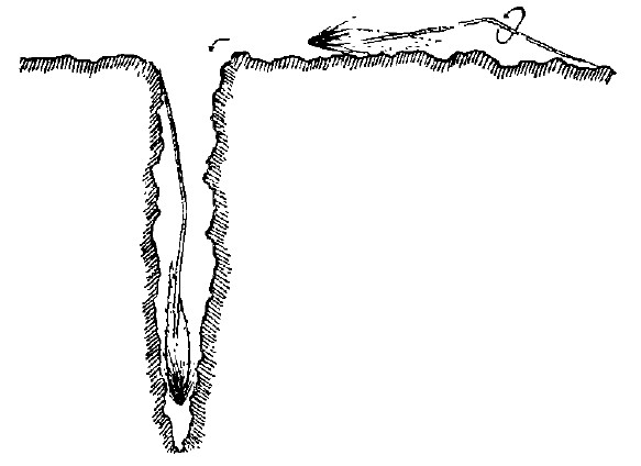 野燕麦种子借长芒的旋转自行钻入土壤裂缝中的示意图