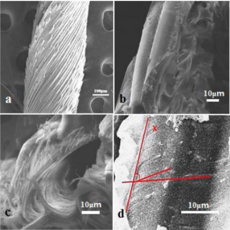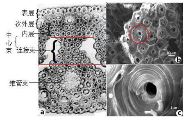 1983年Raju和Ramaswany研究了野燕麦麦芒所含纤维细胞的吸涨特性,认为野燕麦麦芒内层和外层细胞的涨缩性能差异引起了干燥和吸湿时的螺旋和解螺旋运动。他们研究发现,野燕麦主芒的纤维细胞壁由纤维素、半纤维素和不溶性多糖、果胶组成,除维管束外其佘纤维细胞不含木质素。他们分别对野燕麦主芒的各层纤维细胞的吸湿变形方式进行了研宄,提出了野燕麦麦芒吸湿后的解螺旋运动类似于内外两层变形能力不同的橡皮管粘连后产生变形的观点。